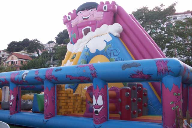 Doppio accesso frontale ai tappeti giochi laterali (con ostacoli e soggetti ispirati al mondo delle fiabe) dai quali si arriva alla salita posteriore (scala a corde) molto impegnativa che porta in cima all’imponente scivolo centrale. Tutto il gioco è circondato da pareti e reti di protezione per la massima sicurezza dei piccoli utenti.